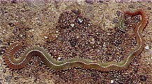 多毛綱チロリ科に属する虫で、日本各地の浅海お砂や 砂泥底に多く15cmぐらいになる。シロギス釣りのエサとし て使われる事が多い。 |