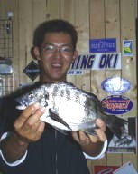 | (4月21日)今日は、待ちに待った大会当日、ヤル気満々の僕は、3時30分に起きて準備をしていると、雨がジャージャー降り、風はブーブーと最悪のコンディションでした。まず下げ潮いっぱいをA航路付近中心に攻め、上げ潮になったら瀬戸へ行きました。そしてジグミノーでひたすらキャストしていると、ゴッゴン!ナイスバイト、と思いフッキングすると”ギープッチン”ラインブレイク!あーと思いドラグ見るとガッチガチに閉めてありました。残念でした。皆さんも僕みたいにならないように準備は前もってしてください。 by