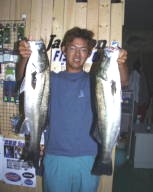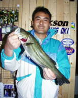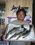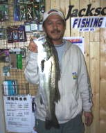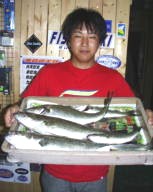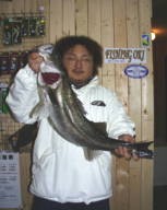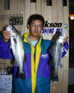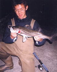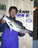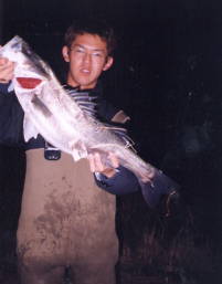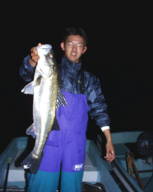 (5月9日)曇り、風少々、釣行時間19:00〜22:00 漁多ONEをまともに投げた事のない僕は、朝倉君に誘われて3番航路筋へ行きました。ライズはまったく無く釣れるのかなーと思い、一投目アタリ無しと思いきやバシャバシャ!横を見ると朝倉君が釣ってるじゃありませんか!そしてその近くへキャストするとゴンとアタリ、フッキングして上げると40cm位のシーバスでした。それからちょこちょこライズが出だして鼻息ボーボーさせながら、アタってはアワセ、アタってはアワセの繰り返し25cm〜50cmのシーバスが5匹釣れました。”うん”このルアーはいい浜名湖にはこれだ!と思った今日この頃でした。 by幸二 |