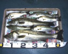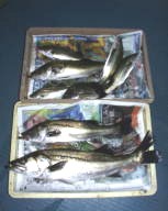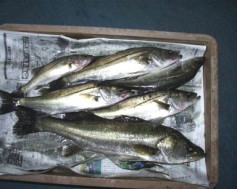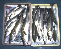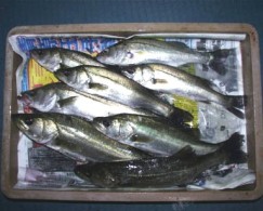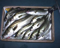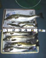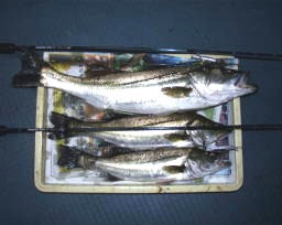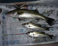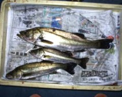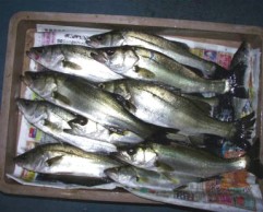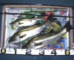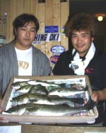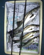(10月8日)今日は玉木さん兄弟をガイド。先週から良型クラスがヒットしているので、今日も期待充分。予想通り50cmクラスがポツポツ混ざる中、レギュラーサイズの35〜40cmが釣れ続く。玉木の兄ちゃんの方に55cmクラスがヒットし、60・70cmと期待するものの今日はダメだった。クロダイもヒットし、更に釣れ続く。一人がバラすと、隣でヒットし、またバラした人にヒットするという感じでおもしろーい!合計シーバス15匹クロダイ2匹でした。 by良太 |