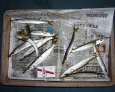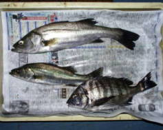 (8月22日)台風通過後、やっと静かになったのでちょいとシャレつけてキビレ釣り師となる。エサはユムシ。18:00頃にフィッシング沖の常連さんにポイントをゆずってもらった(涙)。すると、いきなりアタリがあるが、バラシ、暗くなってすぐ30cmクラスのキビレをキャッチ。その後すぐにアタリがあり1.5kオーバーのキビレをチャッチ。エサ切れで、帰り際にシーバス狙ってみると、25cmクラスながら、3匹キャッチ。10分程で3匹だから、こりゃ調子よくなってるぞ!こりゃー面白そうーだ!! by 良太 |