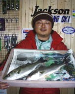(12月8日)秋田君とマコトサンと東京へ遊びに行った。ついでに釣りしちゃおうと、ボートスタッフさんのガイドによる釣りを楽しむ事に…。2時間半で東京入りした僕たちは、次の日が大雪で帰れなくなることも知らずに遊びまくった。浜名湖とのあまりの違いにパニックになるが、良い勉強にもなり、本場のガイドを見て、新しい発見もあった。シーバスに対する考え方も少し変わった気がする。東京連絡所の皆さんありがとう。 |
