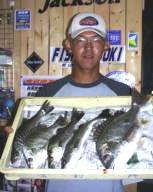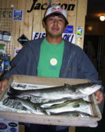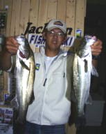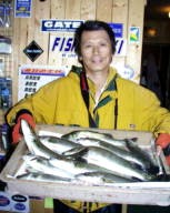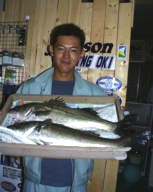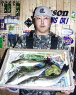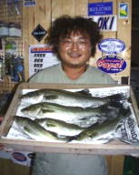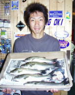 (5月11日)今日は、シーバス狙いに、浜松市の渥美さんをガイドしました。無風、上げ潮ガンガンの中、3番ミオで流してみると45cmクラスが追ってきたのですがノーバイト!下げ潮になるとダラーンとした、たるい潮に…。まいったなあーと思いながらも、潮の効いている所をさがす!今回はマル秘とさせていただくポイントで、渥美さんにヒット!上がってきたのは60cm。その後もバイト連発。バラシ合戦!ボクにやっとヒットしたのは、またまた60cm。その後45cmがヒット。小型は無数にアタリがあり笑えた。 ご利用ありがとうございました。渥美さん by良太 |