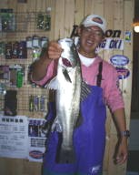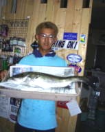 (5月23日)晴れ、無風18:30に店を出て奥浜名湖へ行きました。周りにはビッシリとベイトがいてどこへ投げても釣れそうな感じ、キャストを繰り返すうちに朝倉君が「うっ」と言ったので「どうしたの?」と聞くとバイトがあったと言ったので、ボクはヤル気満々になりキャストしまくりました。すると朝倉君がヒット!すかさずタモを持ってランディングすると46cmのシーバス。僕はなおさらヤル気満々になりキャストを繰り返したけどバイトだけに終わりました。トホホ… by幸二 |