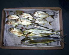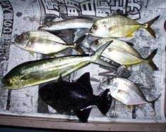 (10月5日)朝、メッキ狙いで出船。いきなりカマスの群れに当たり、ガンガン食ってくるのに対してすべてバラシ!やっと1匹キャッチしたと思ったら群れが消える。移動中、何気に入ったポイントで、メッキとシイラが入れ食いになる。楽し、あー楽しい! by良太 |