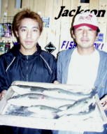 (6月13日)ムッカツクでえーい。操船してポイントに入ったら、秋田さんが、いきなり73cmを釣っちゃうし…吸ってたタバコもマズかった。50cmクラスを2匹釣ったものの、イケスを見ると悲しくって…。25cmのセイゴも釣れたけど、秋田さんが釣った魚のエサみたいで…。あー悲し。明日の仕事は、はかどらないで。でもバラさず釣った腕前はみごとでした。ボクなんてアキタ節で言うと「ギーギー・ブチン」「あーバレター」ばっかだもん。 by 良太 |