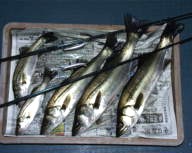 (5月31日)今日は前回ガイドをした渥美さんをガイドしてきました。当日は無風ベタナギ!おまけに潮がタルイとまさしく最悪の状況!金曜日という事もあり、キビレ釣りが多いだろうなあーと思ったものの誰ひとりとして見えない。あー皆サッカーでも観てるんだろうと思いながら3番ミオへ。タルイ潮の中3本私がキャッチし、渥美さんにもヒット!が、しかし、なんじゃ?ウ・ウグイじゃった。がっかりする間もなくまた渥美さんにヒット!35cmクラスのシーバスを無事キャッチ。時間になったので本日終了です。 psあー釣れて良かった。ホッ by 良太 |