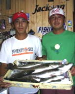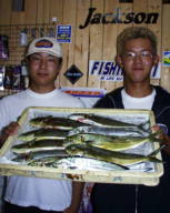 (7月23日)ハローの原稿を書き終えたので今日は出船するぞ!今日は、青山君と釣行。A航路へ行ってみるとイワシがチラホラ見える。漁多Oneをキャストしてみると一投目から50cmクラスがヒット!。青山君もすぐに50cmクラスをヒット。よく見るとイワシとバチが混ざっている。これは、イケルぞとキャストしてみると、ヒットの連続!気付いてみるとイケスの魚は酸欠で死にそう。すぐ帰る事にし、本日終了。50cm〜60cm6匹と25cmクラスが3匹でした。 by 良太 |
