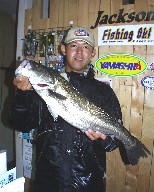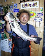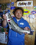 (6月3日)微風 今日は佐原艇、秋田艇に分かれて出船しました。3番中心にミノーをキャストし1投目40cm、その後アタリだけで、イマイチのりが悪い。挙句の果てには、アタリまでなくなりました。場所を移動していると、潮目があったので潮目沿いを流すとゴンッとアタリ、上げてみると45cm。そこから2本立て続けに釣れた。店に戻ると佐原君が5本釣っていました。うーん、いい日だったなあー by 幸二 |