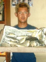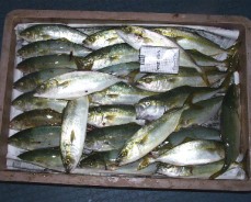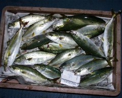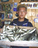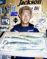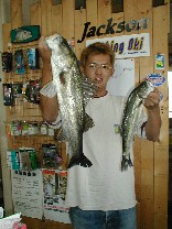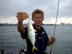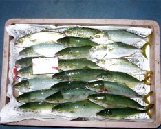 (7月31日)一昨日、シオ(カンパチの子供)が釣れたので、沼口さんと3人でアブゴ狙いで出船。1番ミオで大きなナブラを見つけ、船の位置に注意しながらキャストするとワカシが連発。すぐにスレるのでルアーチェンジを数十回。そのたびに釣れる。シーバスは50cmクラス1回バラシのみ。ワカシ18匹でした。 by 良太 |