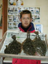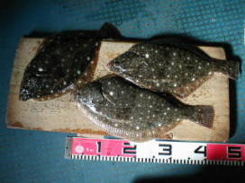 (11月23日)今日は朝6時半からカレイ釣り、前の週に1匹釣れたから調子に乗った訳。1時間に1匹のペースで42cmを頭に40cm以上を3匹。小さいカレイ1匹。手前に来てからの突っ込みにはヒヤヒヤ。下げ潮でアオサが多かったから、手前までゴリゴリ巻いて魚だと気づいたことも1回あった。カレイ!オモシロイわ。 by 良太 |