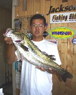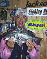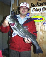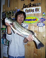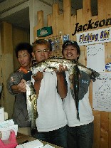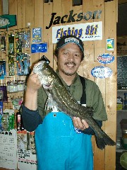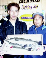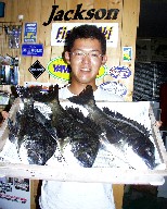 (6月12日)最近数釣りがうまくできなくてHPにアップできるような写真がなかった。数釣りをあきらめて良型狙いに変更。漁多ONEのニューカラーでヒット!ヒット!バレるバレる。キャッチしたのは73cm1本のみ、秋田氏は45cmサイズを3本だって! by 良太 |