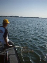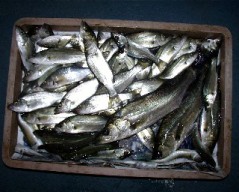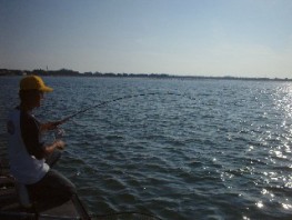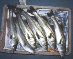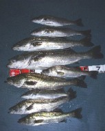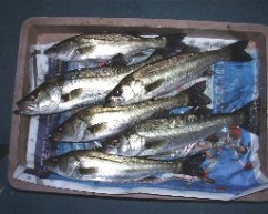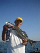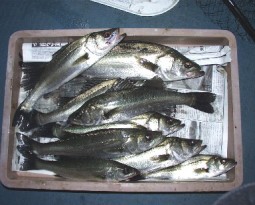 (9月2日)朝6時から出船。水面の変化を探しながら、魚を釣ろうと船を走らせた。7:30頃ナブラを見つけ、心の中で「ヤリー!」と叫ぶものの正体は20cmちょっとの新子セイゴ。しかも入れ食い。ヒラセイゴが多くホシセイゴも混じった。45cmクラスは2匹だけ。晩秋に35cmクラスのヒラセイゴが釣れるかな? by 良太 |
