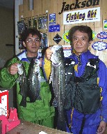 | タモ入れ成功 | よく肥えてるなー | 満足じゃー | 店で記念撮影 |