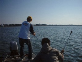 幸二 早春は難しいなー。小さなシーバスがポツポツで出したものの、居場所がコロコロ変わるし食いが渋くて話にならんぞ!今日はデカイ奴が一本ヒットしたもののラインブレイク。バイバーイと言っているかの様にエラ洗いして消えた。一緒に乗っていた青山君が40センチクラスを一本。渋い by 良太 |