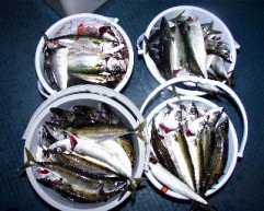 (8月17日)今日はサバ狙いで出船。潮があまり動かず活性は低そうだと思い、行った事のないエリアまで大移動。これが大正解デ、サバの入れ食い!サビキの横でメタルジグを使ってみると入れ食い!バケツ4杯!疲れた! by 良太 |