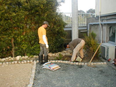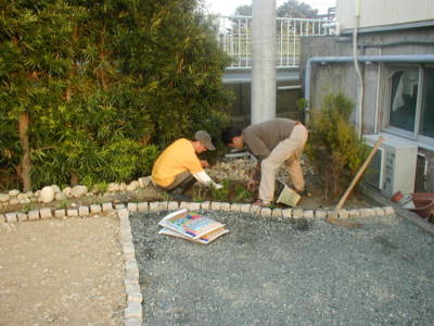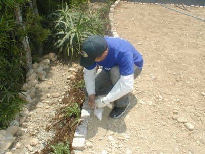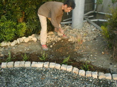 駐車スペースの境に石を並べる園芸部長の利一君 |
