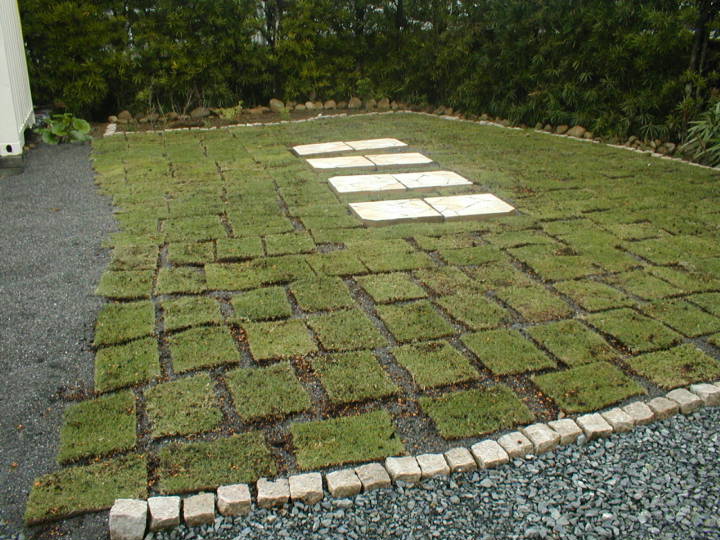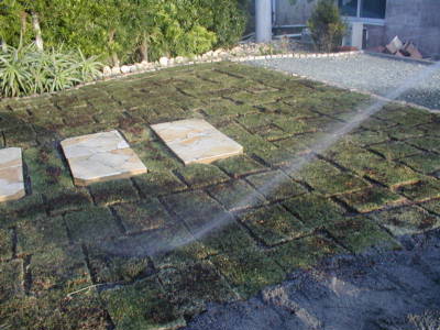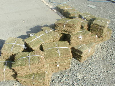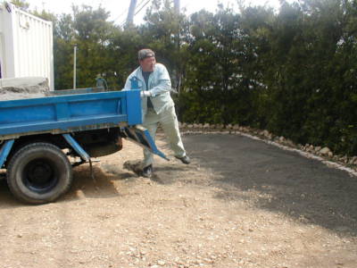 | (5月15日)今日は午前中にスズタカ建設のたかしくんに砂を入れてもらった。午後から芝を貼る事にする。 |