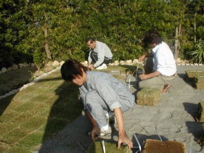 さっそく園芸部員達によって貼られていく高麗芝 |